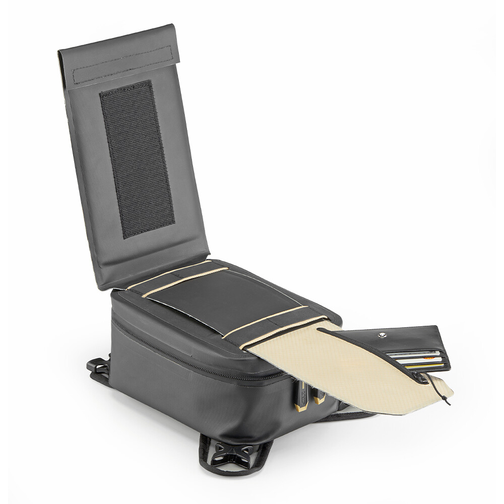 Túi bình xăng GRT729 còn được trang bị ngăn đựng điện thoại thông minh chống nước, có thể tháo rời và gắn trực tiếp lên nắp túi, hỗ trợ xem bản đồ vô cùng tiện lợi. Bên trong, ba dây đai đàn hồi giúp cố định đồ đạc, tránh xáo trộn khi di chuyển. Khoá zip kín chống nước và khoá cài chắc chắn đảm bảo an toàn tuyệt đối cho mọi vật dụng.